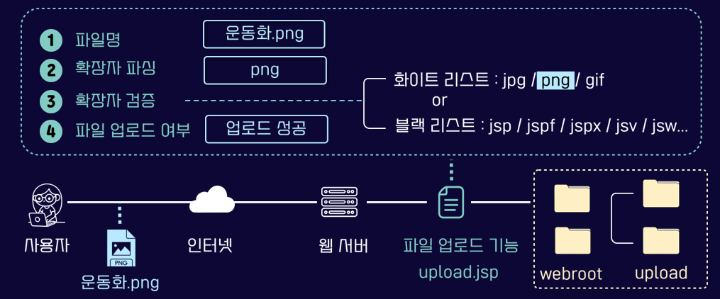 - 파일 업로드 취약점은 악의적인 사용자가 웹 쉘 파일을 업로드하여 실행할 수 있게 되는 취약점이다. 즉, 이에 대응하기 위해서는 웹 쉘 파일을 업로드할 수 없게 하거나
