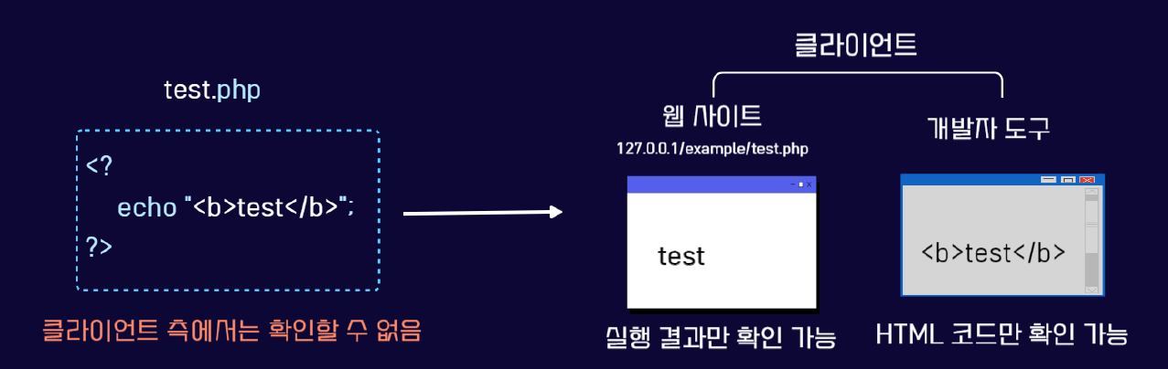 그 결과를 다시 클라이언트 측에 전송하는 것이다. - 예를 들어, 다음과 같이 서버 사이드 스크립트인 PHP로 작성된 코드를 실행하면