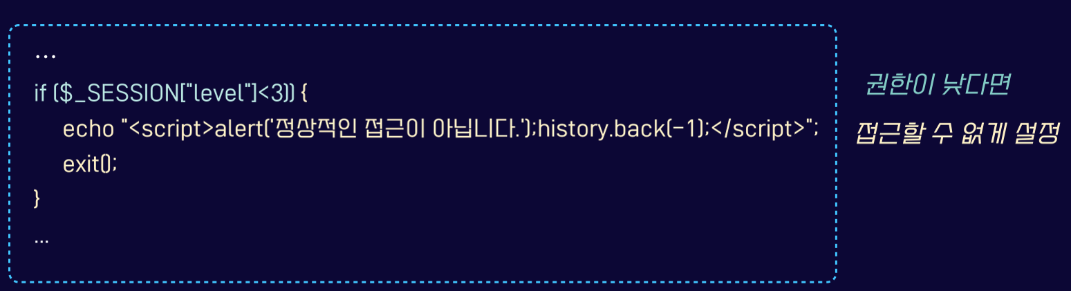 - 인가되지 않은 사용자에 대한 접근 제한 소스 코드 예시 (PHP)