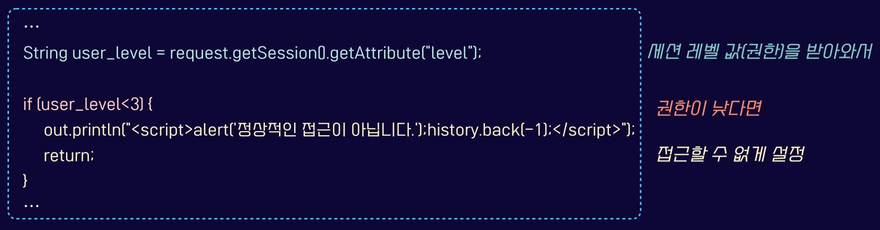 - 인가되지 않은 사용자에 대한 접근 제한 소스 코드 예시 (JSP)