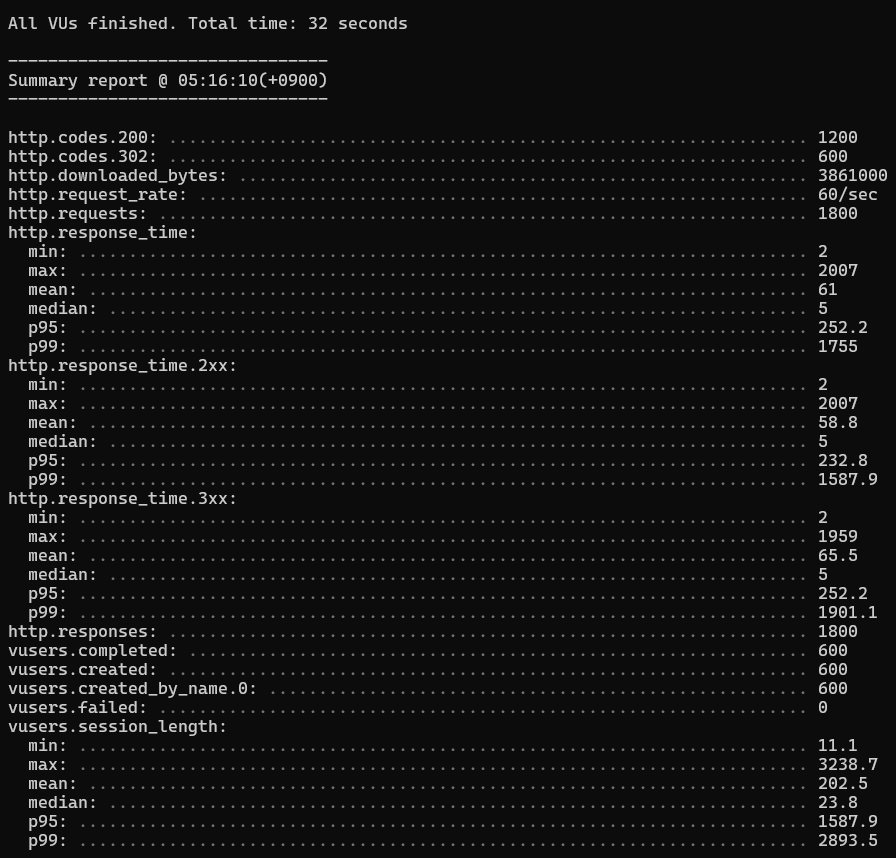 Total time 테스트하는데 총 15초 소요됨 vusers.created 가상의 사용자 100명 생성됨 vusers.completed 그들의 테스트가 전부 완료됨 http.requests, http.responses 모든 요청과 응답이 각각 5000번 수행되었음 http.request_rate 처리 속도, 초당 140번 요청 처리 http.codes.200 HTTP 상태 코드 http.response_time 응답 지연 속도 - 최소(min), 최대(max), mean(평균), median(중간값), p95(하위 95%), p99(하위 99%) - 실제 사용자의 행동을 모방해 시나리오 작성하여 부하 테스트를 할 수도 있다.