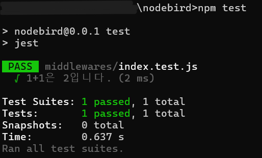 jest는 페이스북에서 만든 오픈 소스 패키지로, 테스팅에 필요한 툴들을 대부분 갖추고 있어 편리하다. 9장의 NodeBird 프로젝트에 jest 패키지를 설치한다. npm i -D jest