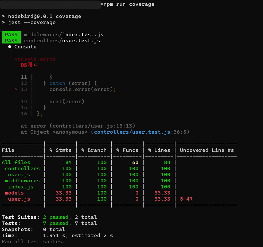 콘솔에 nodebird_test 데이터베이스를 생성하는 명령어를 입력한다. npx sequelize db:create --env test